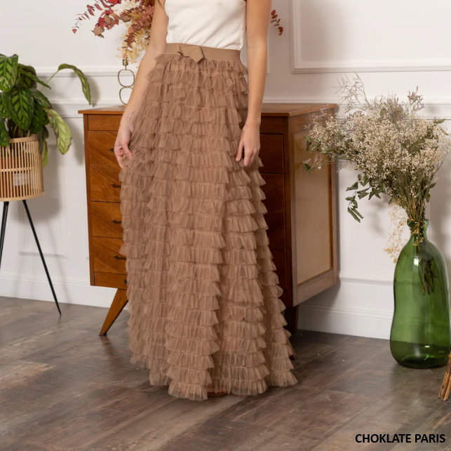 Saia comprida de cor taupe em tule com pregas e folhos, com faixa elástica fina na cintura e forro da marca Choklate Paris.